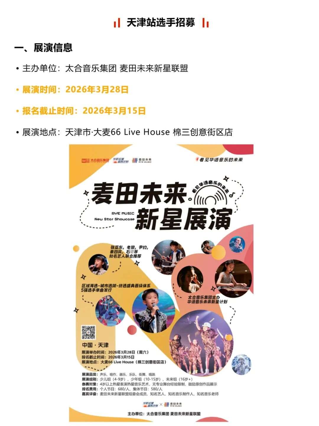 【活动报名】2026年麦田未来新星展演|天津站选手招募开启